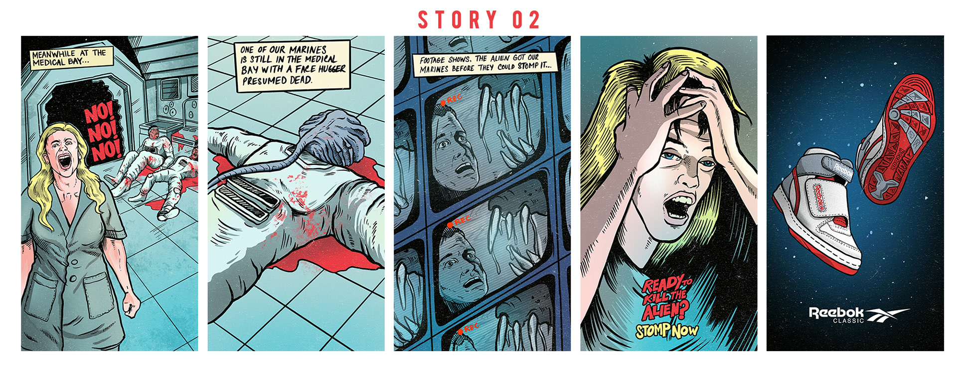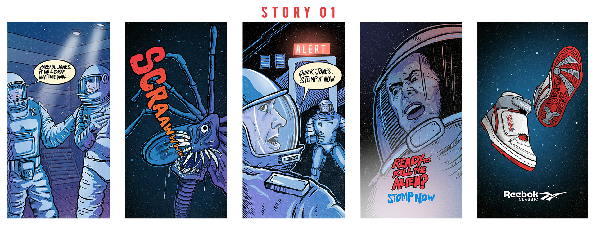 This is series of Illustrated Comics for Reebok Classic India in collaboration with Brandmovers India inspired by the Alienstomper in celebration of the 40th anniversary of the first Alien film.