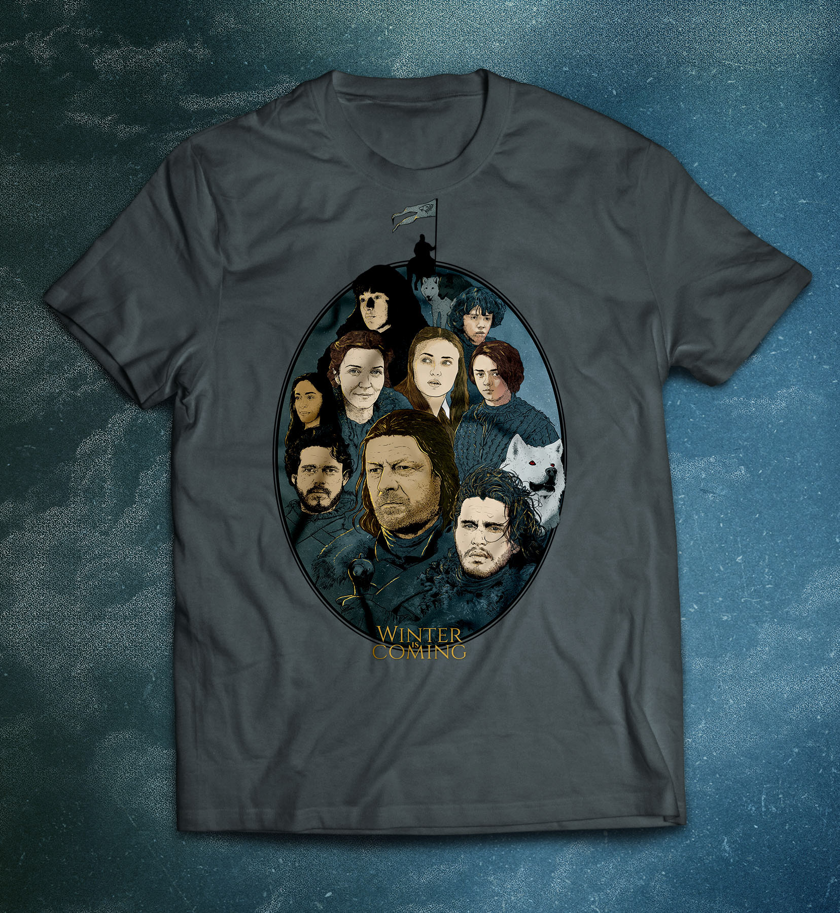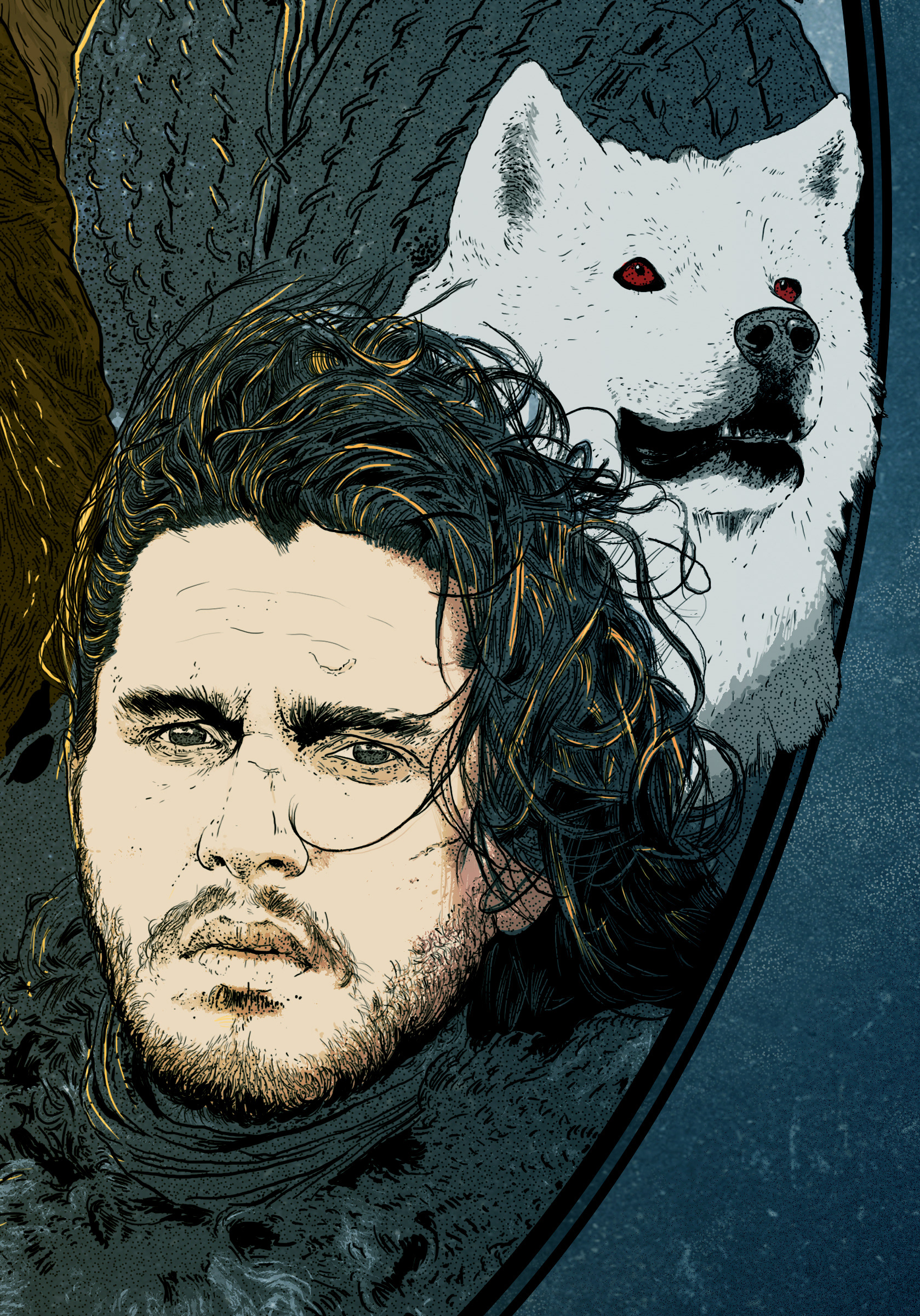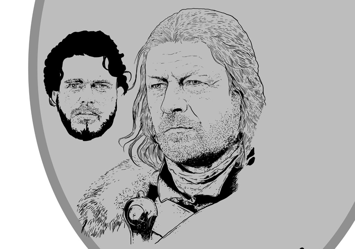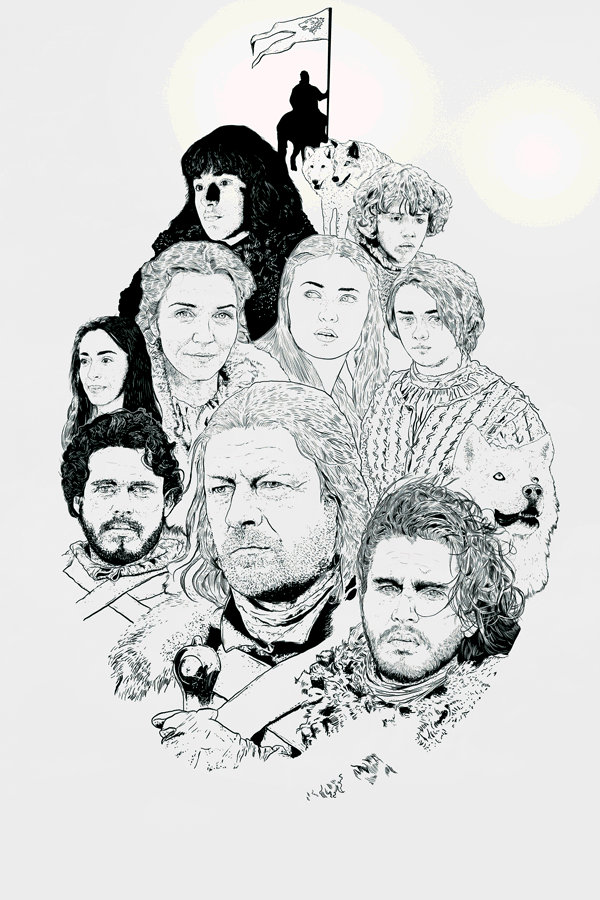 The Starks of winterfell from the Game of Thrones. Inspired bu the vintage style of illustration, this was sketched and inked on paper and later scanned and colored digitally.
